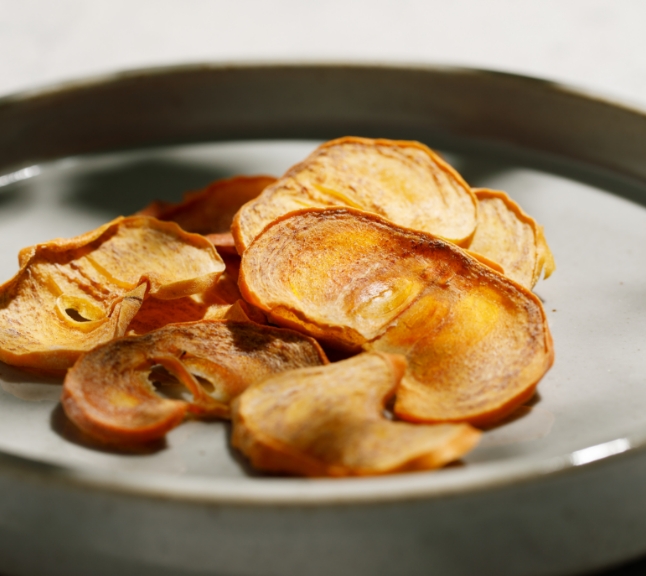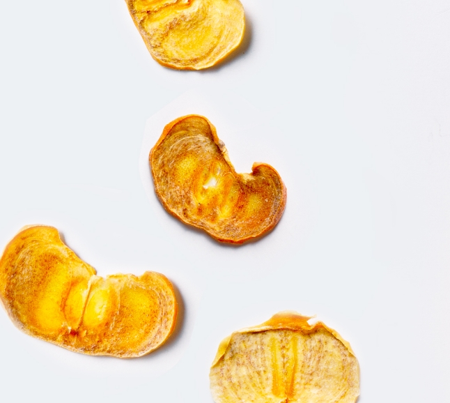 柿を加熱でドライすると、ビタミンAは生柿の約2倍、食物繊維は約9倍増えると言われています。舌にも健康にも嬉しいおやつです。